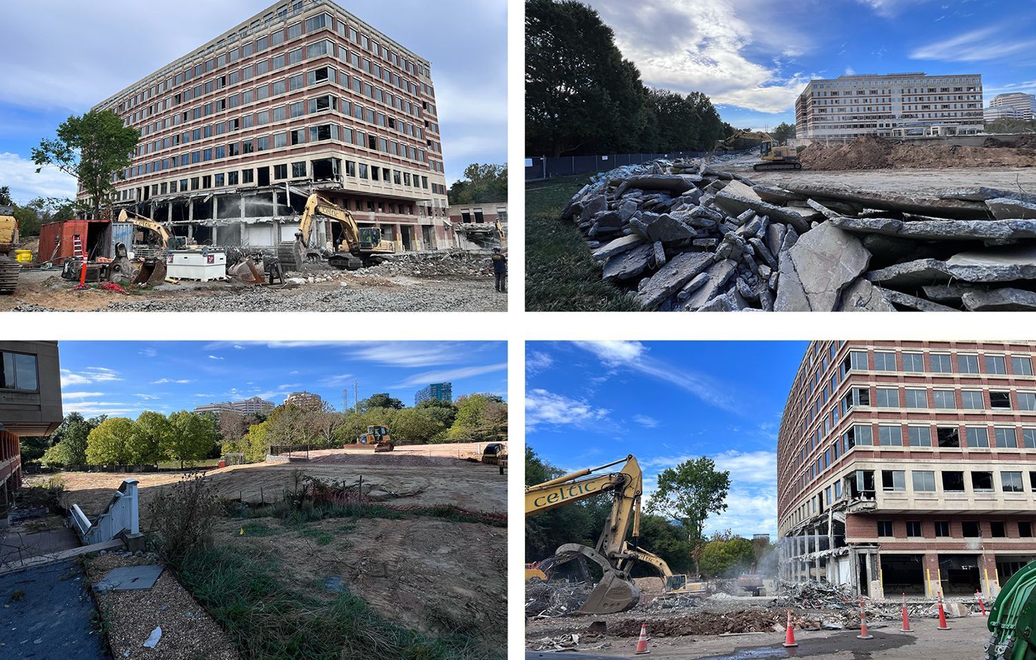 Demolition of the building loading dock area and garage structure on the south-east corner of the site is now underway and will proceed in counterclockwise fashion until the below-grade garage is removed. Demolition of the office building will commence once the garage demolition is complete. The garage demolition work will continue through November 2025.