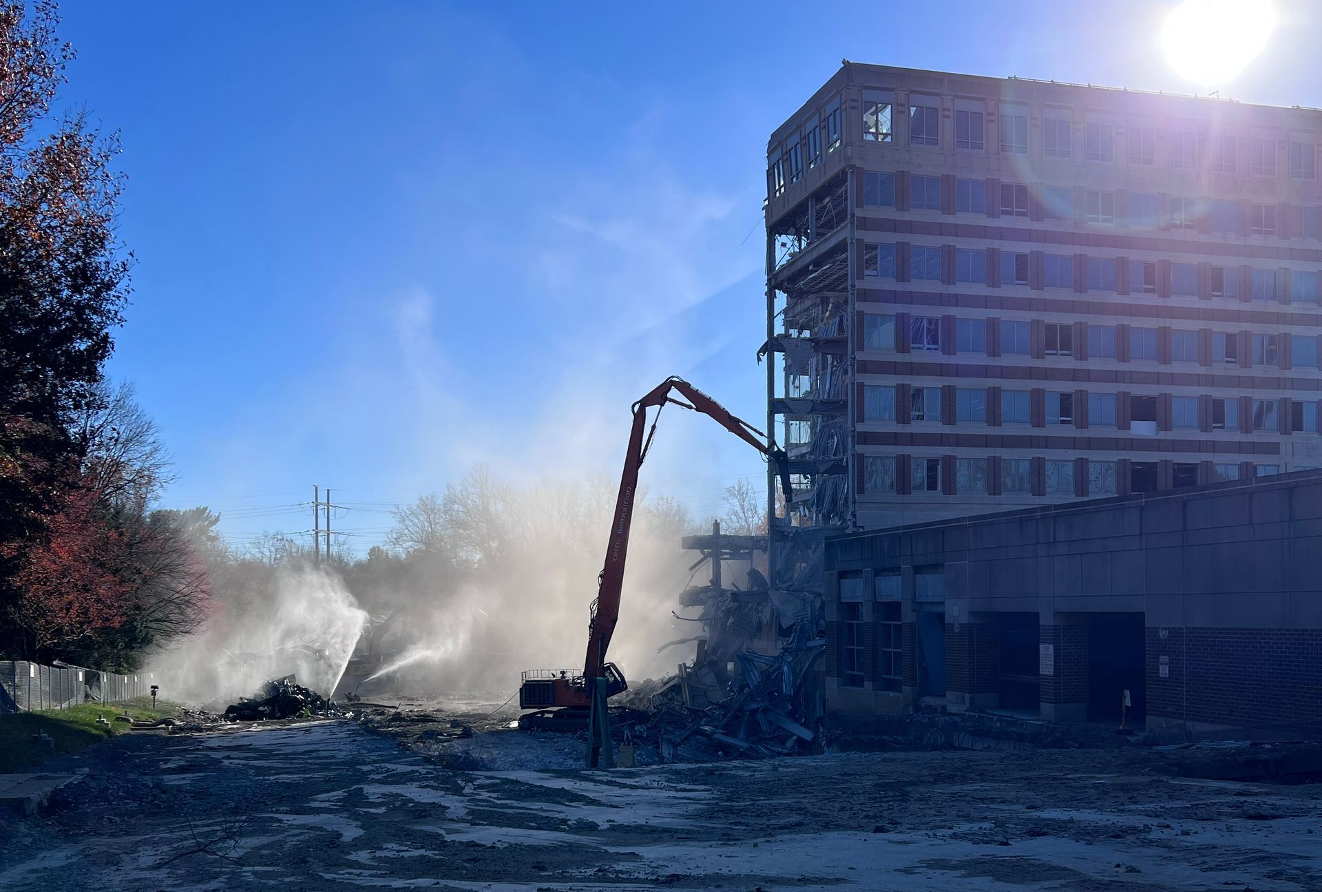 Since the main office building’s structural demolition work can be notably noisy and dusty, Celtic Demolition is using water sprayers to limit dust