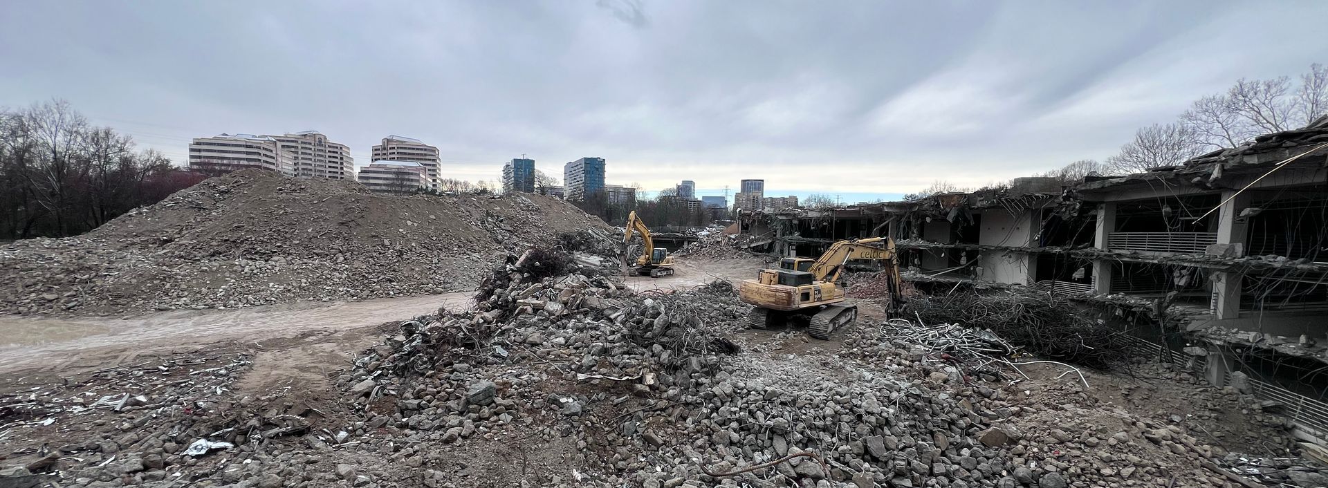 The on-site concrete processing equipment has been delivered and positioned. The demolished concrete processing/recycling is to begin in the near term. Crushed concrete will remain on site, and the balance of demolished materials will be removed by truck via the southeast entrance to Sunset Hills Road. The processing will begin once a majority of the building structure has been knocked down.